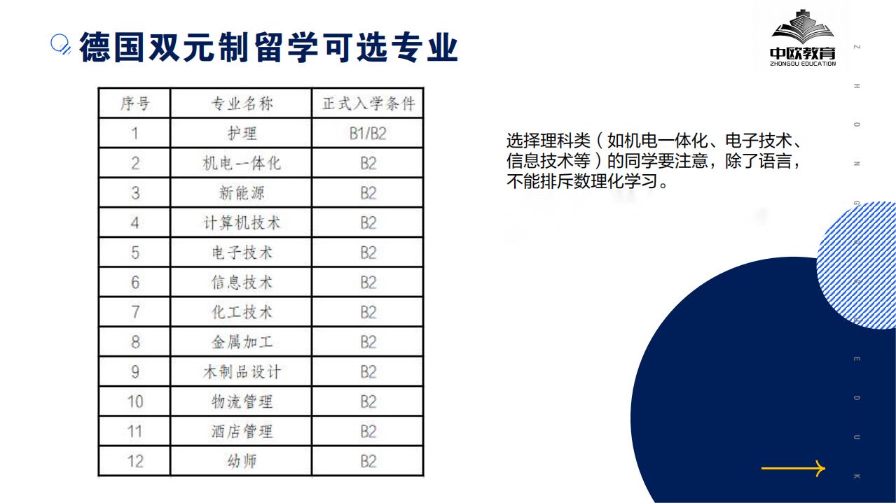 举世瞩目的德国"双元制"职业教育是将理论和实践紧密结合,学生每年一半的时间在学校学习,一半的时间在企业实习,学制3-4年。因为这种教育模式是以企业培训为主,学生通过企业培训后会成为企业需要的应用型人才,所以学生毕业后,即可以在德成功就业。每年约有三分之二的德国学生选择在"双元制"职业学校就读。